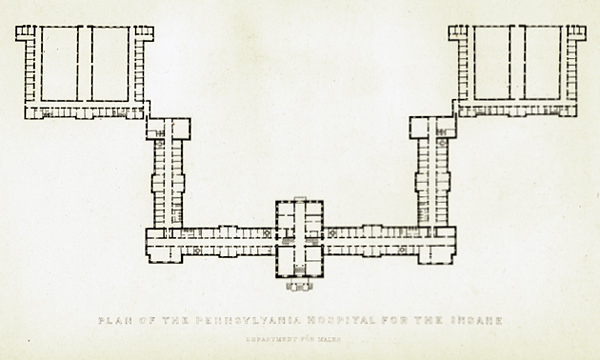 The first plate, or frontispiece, represents the Department for Males of the Pennsylvania Hospital for the Insane at Philadelphia, which was opened for the reception of patients in 1859. The next Plate, II, opposite the frontispiece, shows the ground plan of the same building.