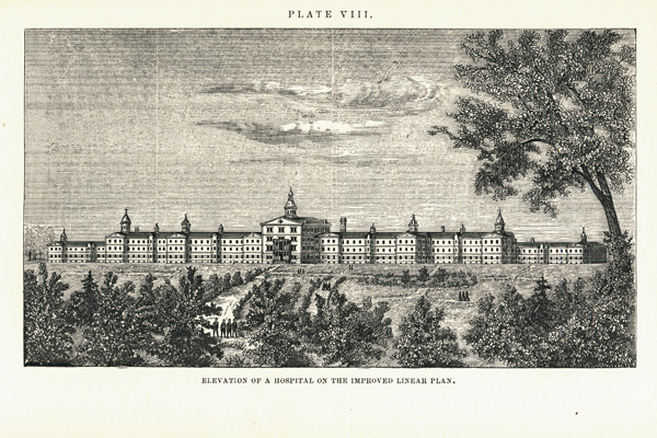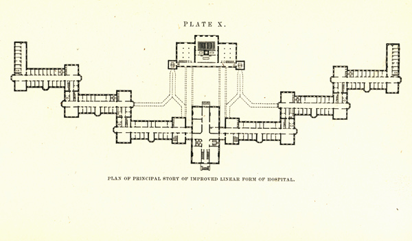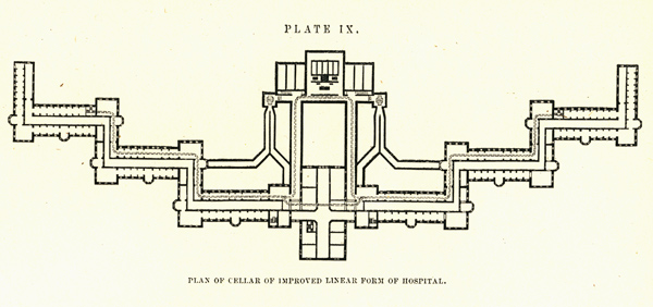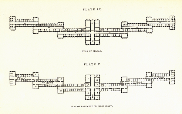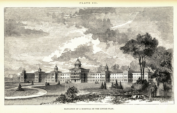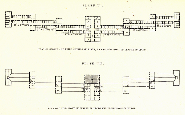 Plates III, IV, V, VI, and VII, show the same elevation and ground plan, with the same detailed description of the linear form, as those which were originally given in the first edition of this book, and which were carried out in all their details in the Alabama Hospital for the Insane, and less thoroughly, although retaining most of their essential features, in many other hospitals in various parts of the United States.